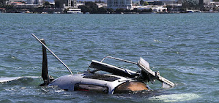 News photos show a modern tandem style gyrocopter painted light brown and green in the sea by the shore.