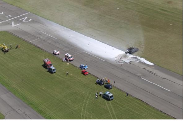 Local news reports "Superintendent Taylor said emergency crews were on the scene within five or six minutes. “The aircraft was still on fire, there was a small grass fire around it and there were a couple of parts of the gyrocopter which were approximately 200 metres away. The fire was put out by the fire brigade.” The reason there were two sites of wreckage formed part of the probe on Thursday when investigators returned to the crash scene.